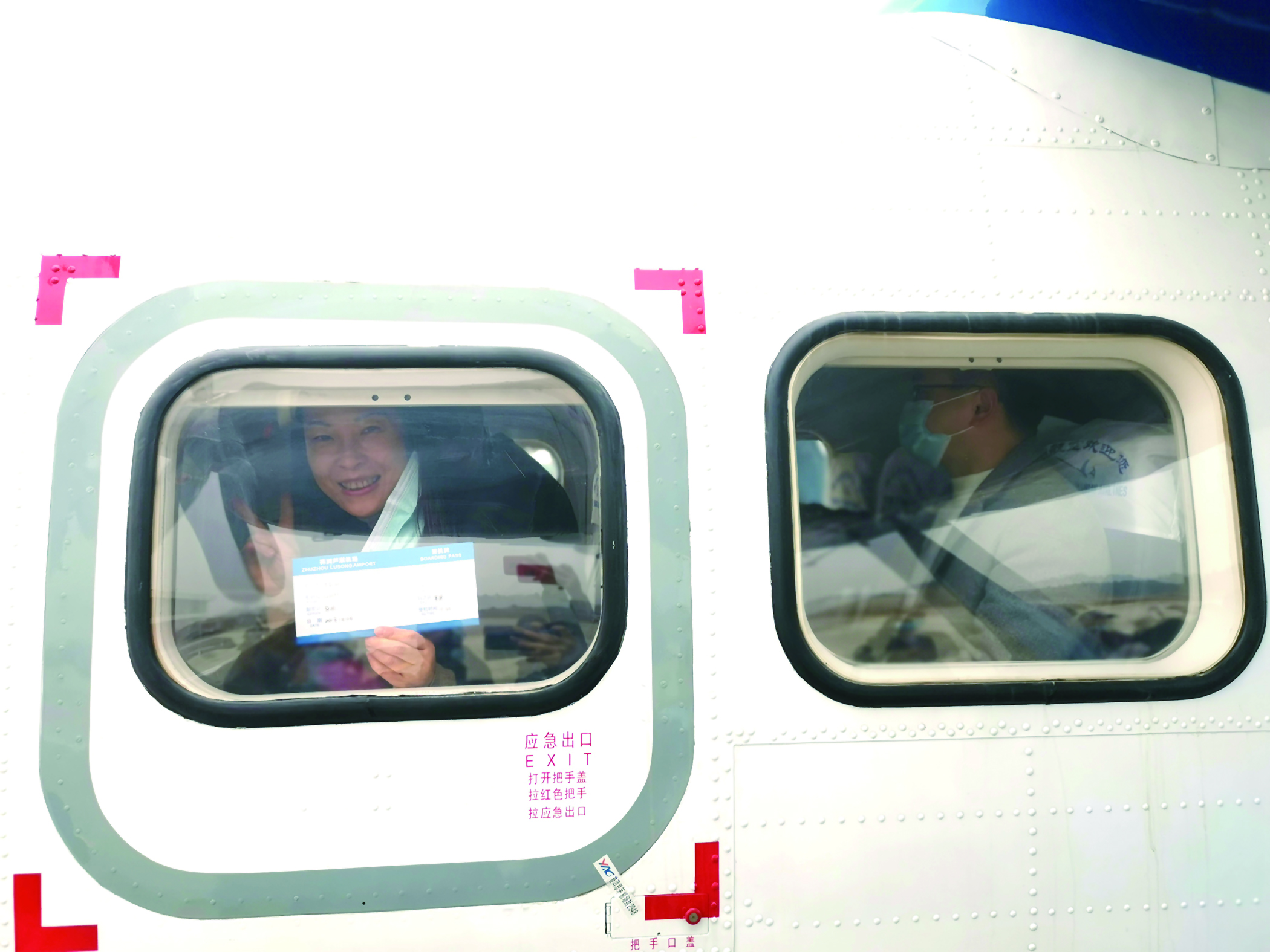 ▲首航乘客在机舱内兴奋地展示自己的机票 记者 戴凛 摄
