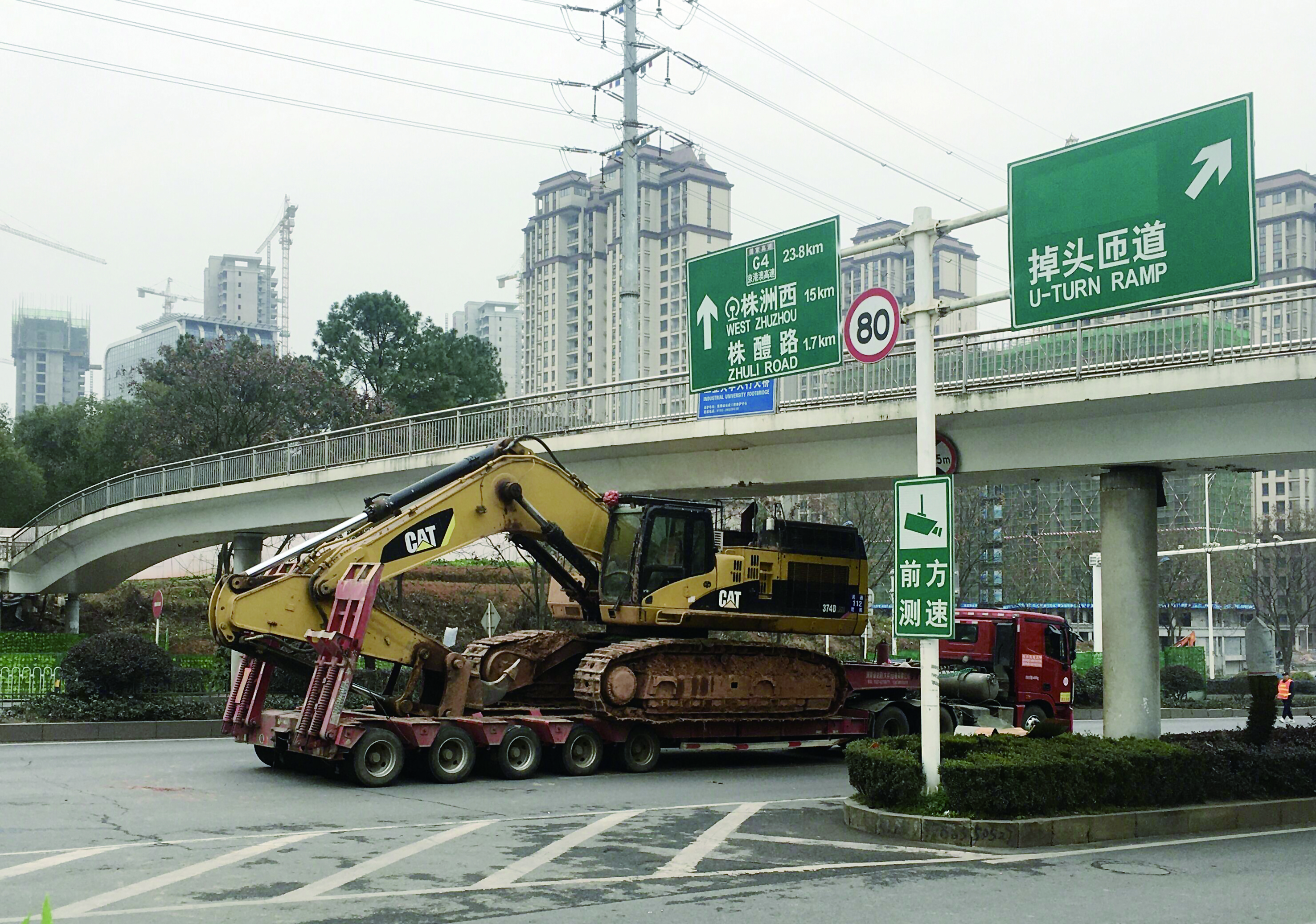在事故现场,记者看到肇事车辆为一辆长沙牌照的半挂车,据了解,该车经过时,由于所载的挖掘机吊臂撞击人行天桥,导致桥体受损。事发后,为避免更大事故发生,交警部门对该路段实施双向全封闭交通管制,周边部分路段出现拥堵。