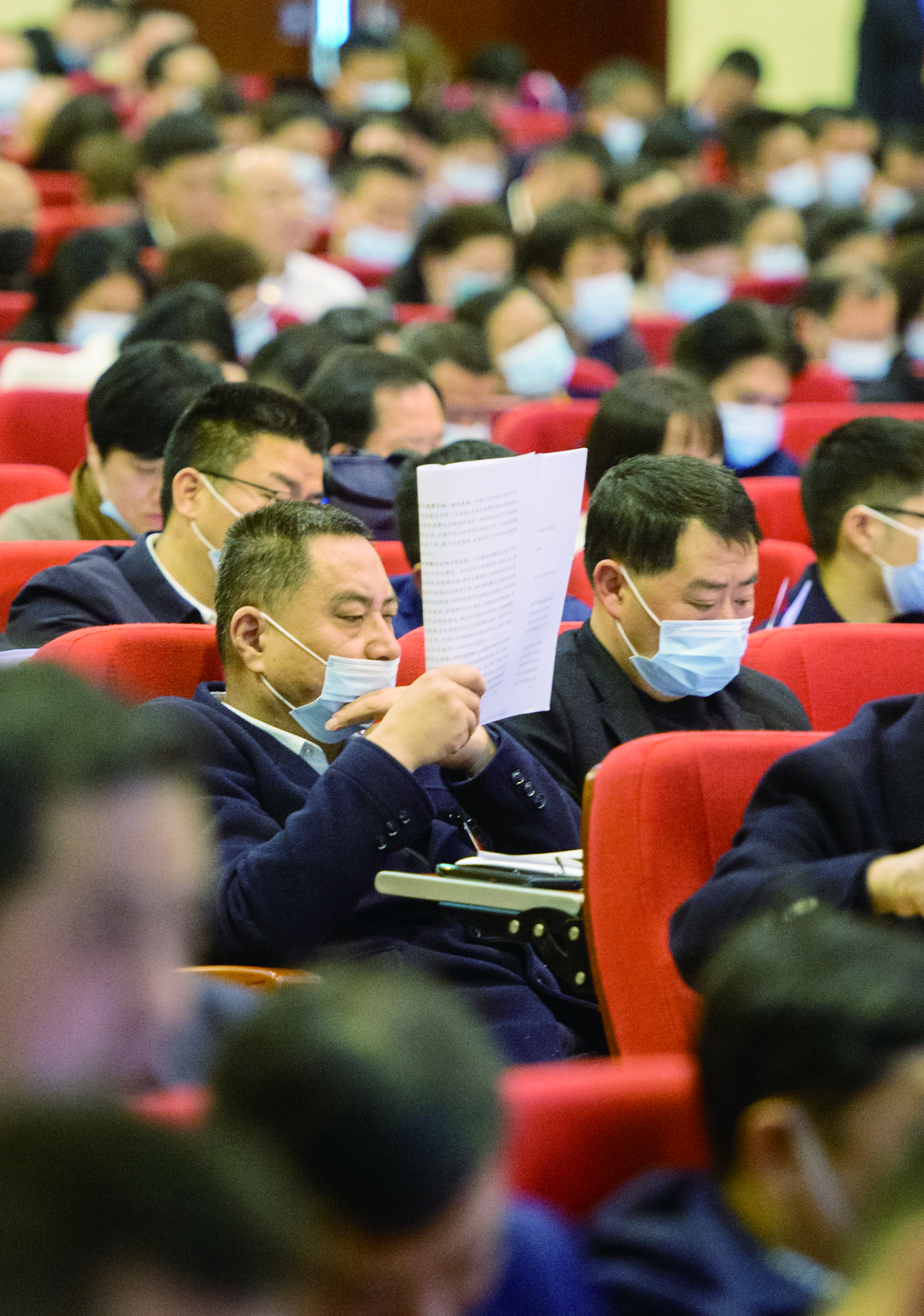 ◀在市十五届人大五次会议上,一位代表正在仔细阅读《政府工作报告》 全媒体记者 易翔 摄