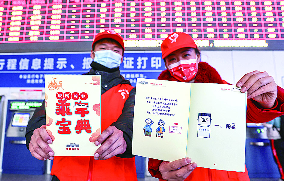 1月21日,徐州东站的“小甜橙”志愿者展示“乘车宝典”。 近日,中国铁路上海局集团有限公司徐州直属站为服务不会上网订票的旅客设计制作了“乘车宝典”漫画小册子,方便“脱网”旅客按照画册上的步骤自助购票乘车。 (据新华社)