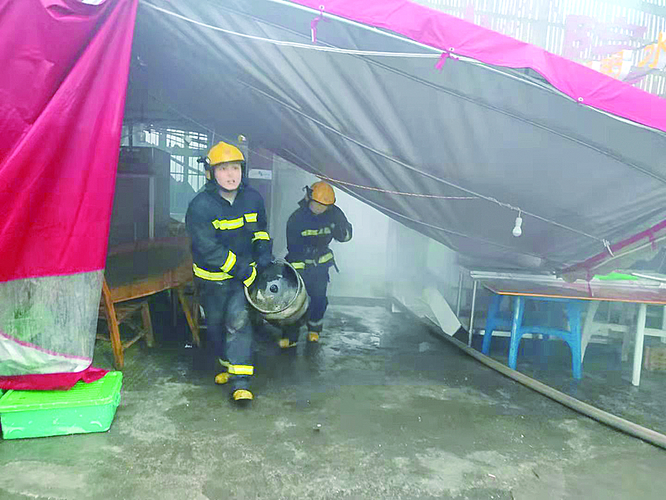 栗雨消防救援站的消防员到场时,发现饭店正在起火,饭店正门口电线短路冒火花。经询问得知,火场内还存有十个大型液化气罐,存在严重的安全隐患,他们立即封锁现场。