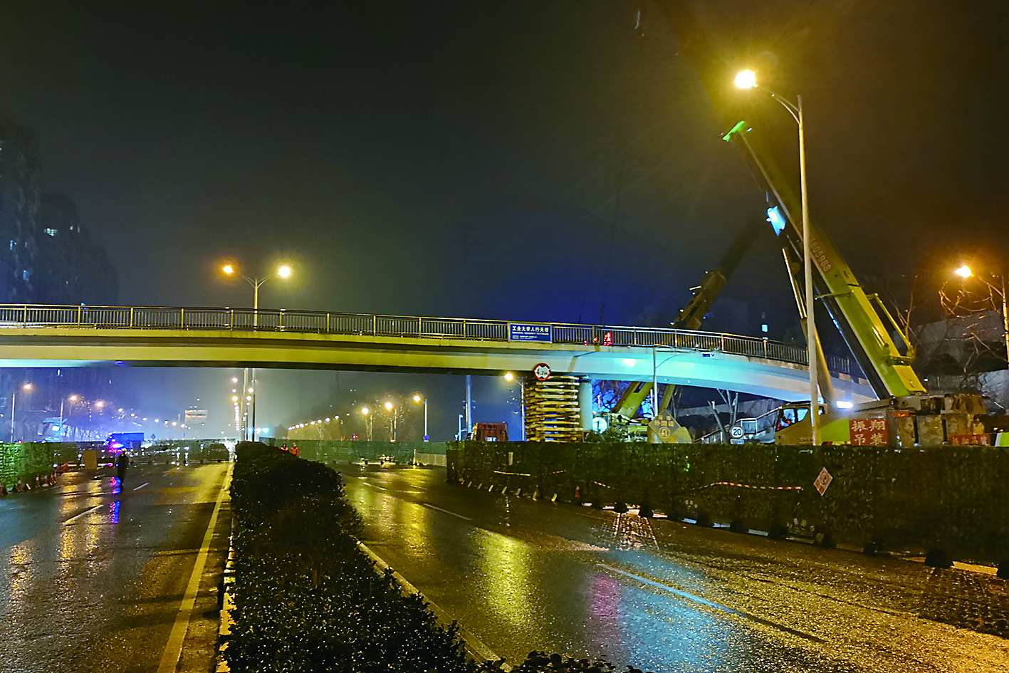 本报讯(记者 伍靖雯 通讯员 石建庚 朱熠)1月25日晚,市城管局市政工程维护中心连夜对东环线外国语学校附近人行天桥实施吊装复位。