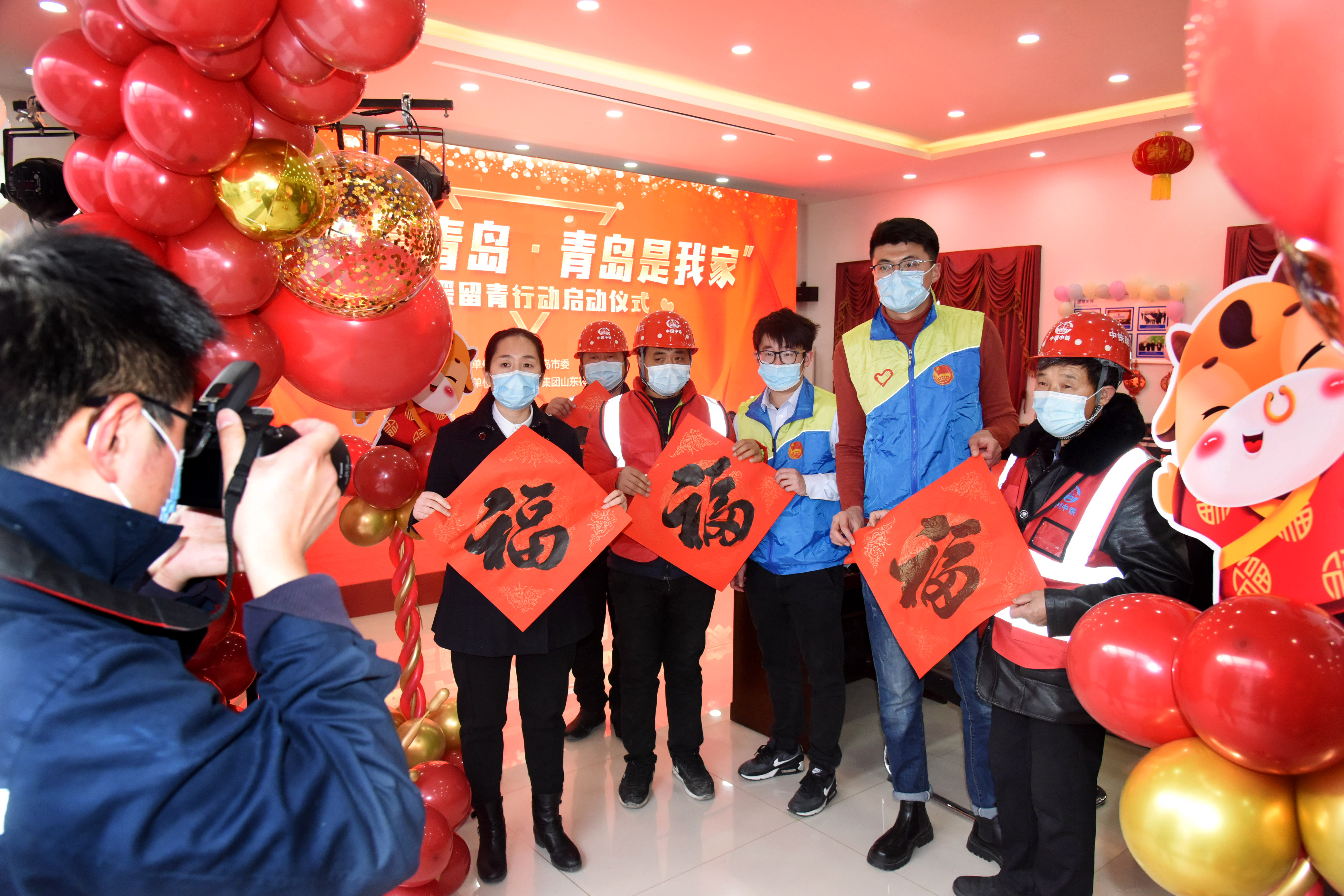 1月26日,职工和志愿者等在启动仪式上合影。 当日,中铁建工山东公司即墨中心城项目部“青岛是我家”温暖留青行动启动,该项目部300多名外地职工将响应号召,选择留在当地与工友一起过年。据介绍,春节期间相关部门将通过组织新春文娱活动、发放过节礼包、家乡视频连线、工棚大拜年等形式为留守过年的外地人员送上温暖和祝福。