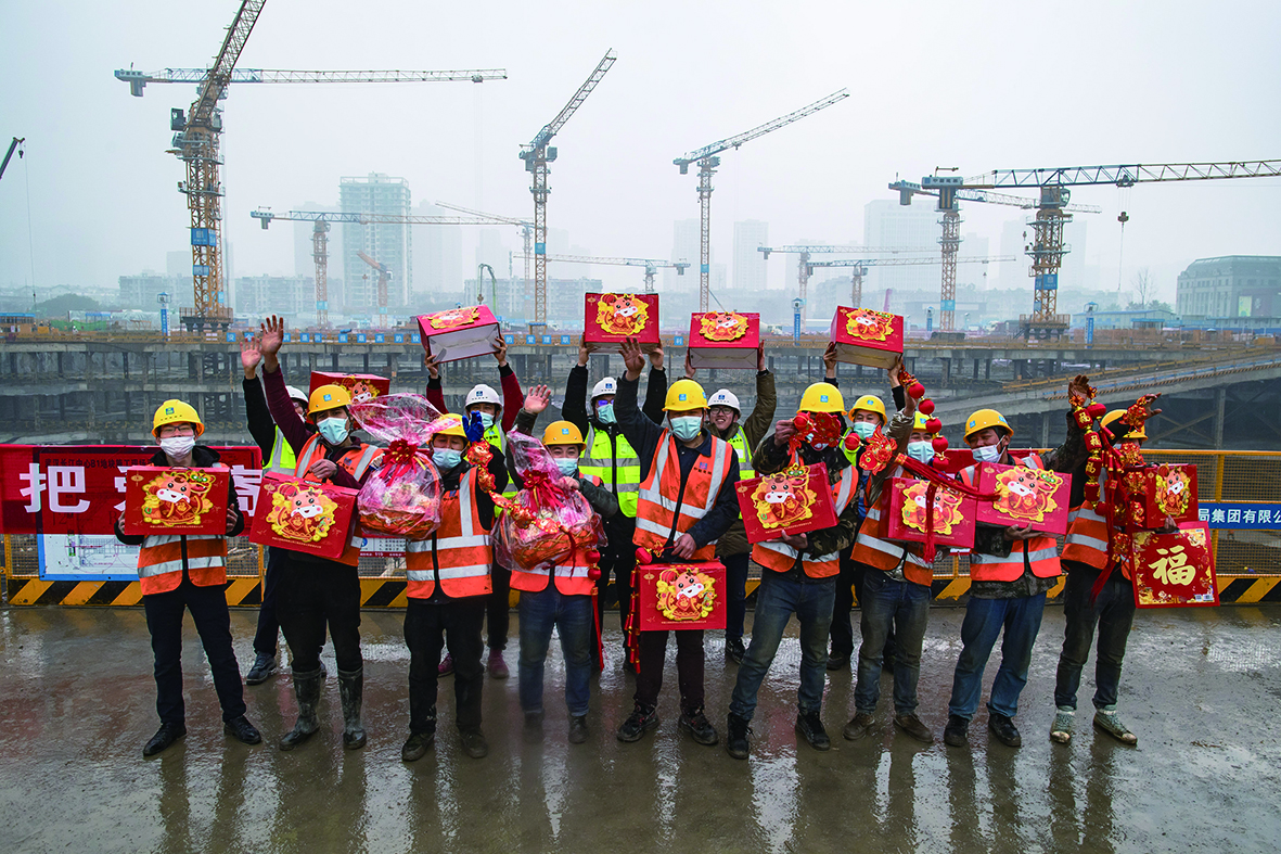 1月27日,工友们拿着年货在工地上合影,随后将照片和年货一起寄回老家。 当日, 在武汉长江中心项目建设工地,中建三局总承包公司为春节值守的工友现场拍摄并打印照片,工友们将照片和书写的家书,以及干果、春联等年货一起,通过上门设立的邮寄点,直接寄给家人。工地项目部同时免费为工友检测核酸、发放防疫礼包,在过年期间,还将在工友生活区搭建临时影院、组织年夜饭、开设工友书屋等,让建设者们过一个安心、暖心的新年。
