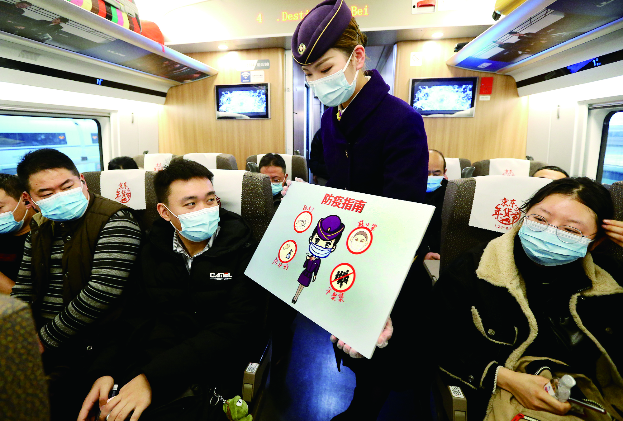 ▲1月26日,乘务员在上海虹桥开往北京南的G124次列车上展示防疫指南
