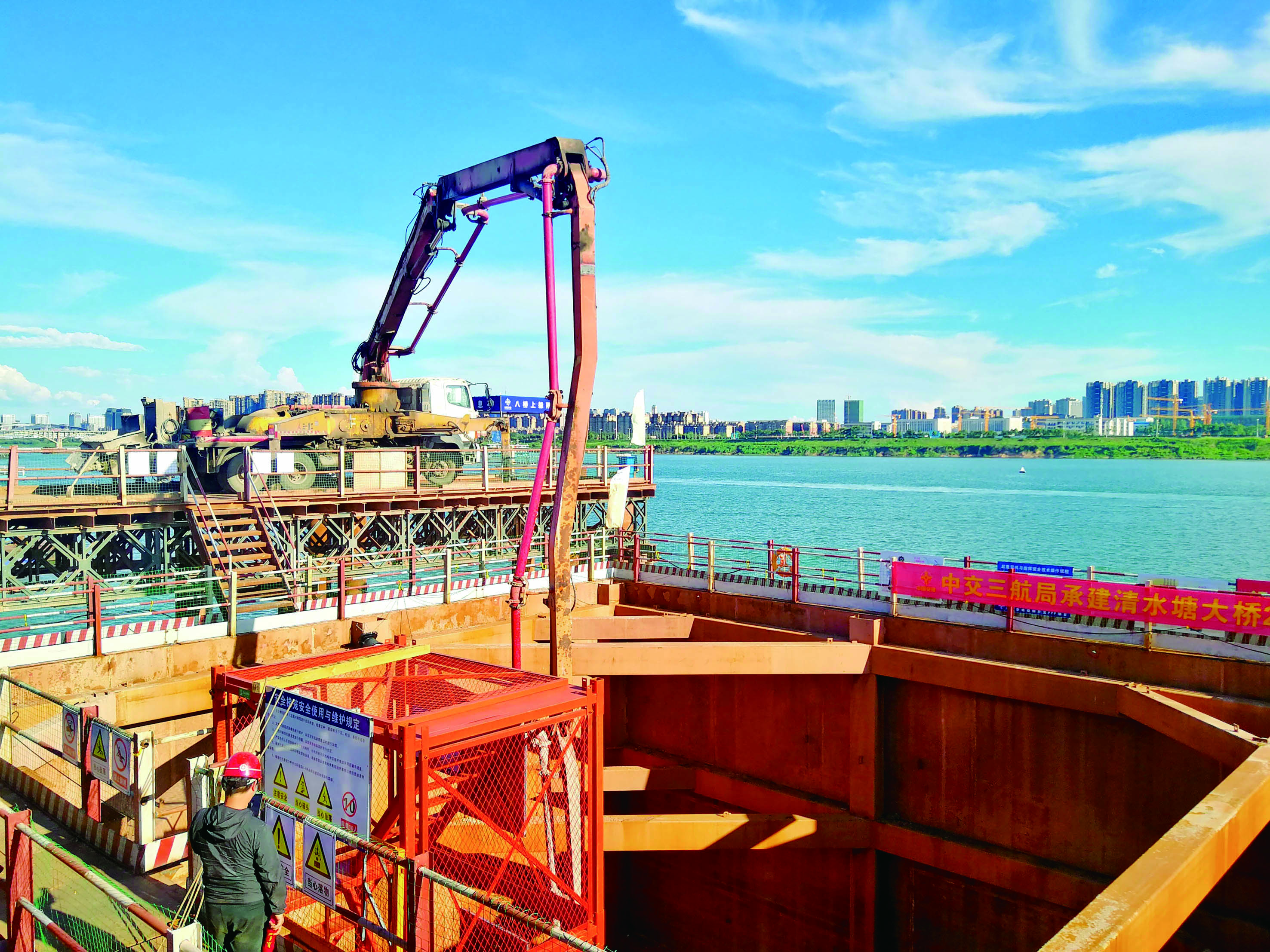 ▲2020年8月20日—21日,中交三航局承建清水塘大桥22#主墩承台首次混凝土浇筑现场 首席记者 李卉 摄
