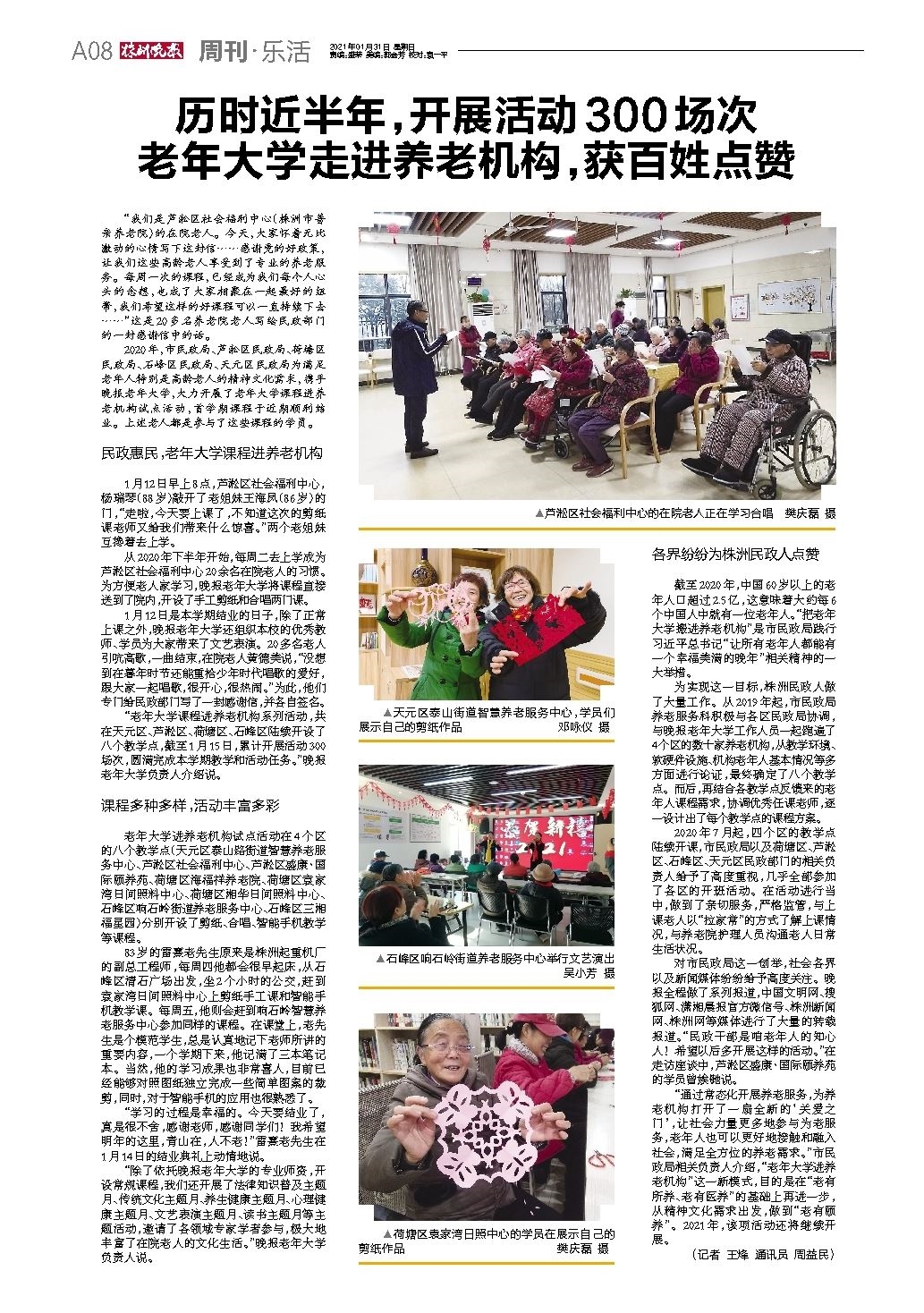 “老年大学课程进养老机构系列活动,共在天元区、芦淞区、荷塘区、石峰区陆续开设了八个教学点,截至1月15日,累计开展活动300场次,圆满完成本学期教学和活动任务。”晚报老年大学负责人介绍说。