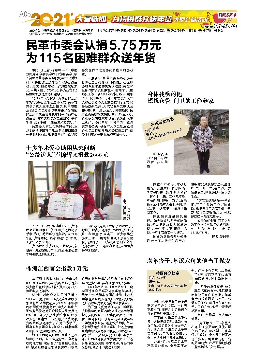 民革市委会认捐5.75万元 为115名困难群众送年货