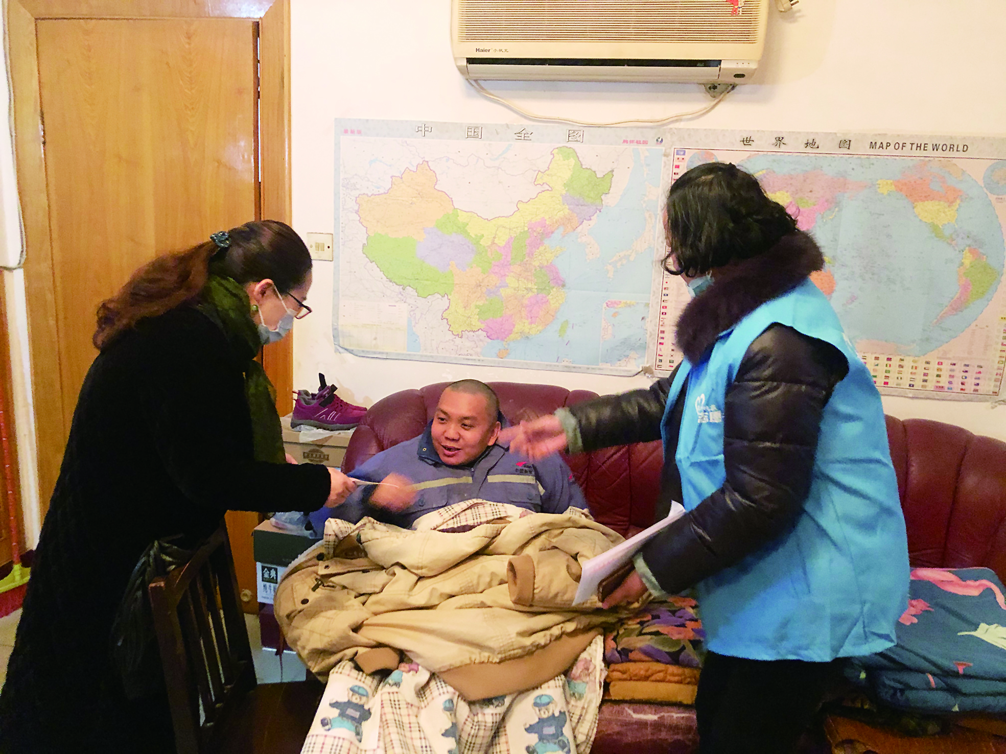 ▲吴晓谊(左)与志愿者一起,代表爱心单位为特困户蒙刚送上慰问金 记者 郑炜青 摄