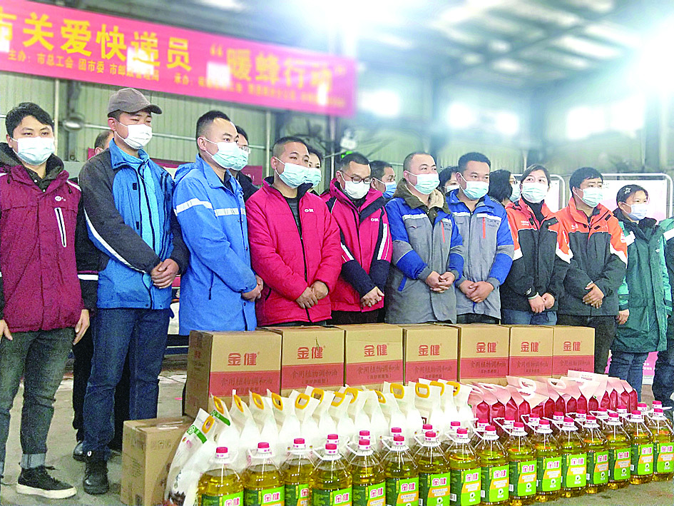 ▲昨日上午,我市启动关爱快递员“暖蜂行动”,为他们送去粮油等慰问物资 记者 何春林 摄