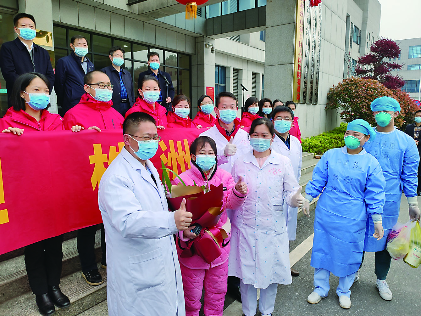 ▲“玫瑰”阿姨(前排居中者)从定点医院治愈出院 记者 杨凌凌 摄
