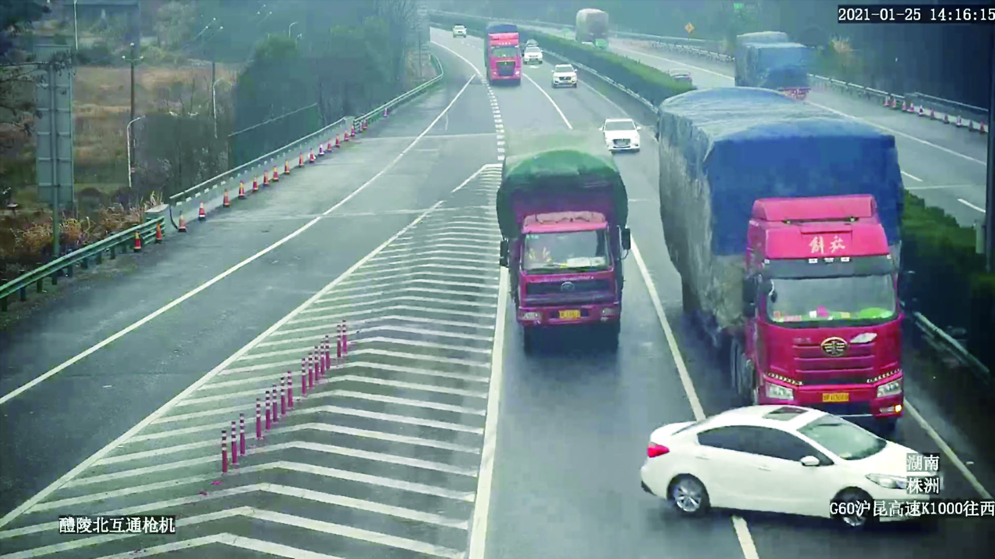 现场监控画面显示,轿车在一辆货车右侧导流线处强行超车时,突然来了个“漂移”,随即失控冲向超车道,与超车道上的半挂车相撞。