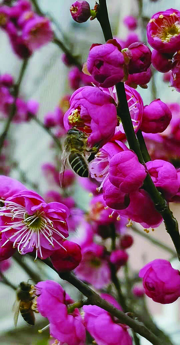 高院红梅惹人爱,蜜蜂翠柳踏歌来。 芳心喜悦花中景,犹吊春风上舞台。 ▲作者:刘春光