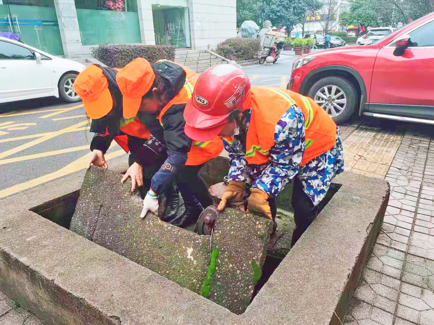 ▲泰山西路,环卫工人唐桂云和同事们合力翻开一块井盖 通讯员供图