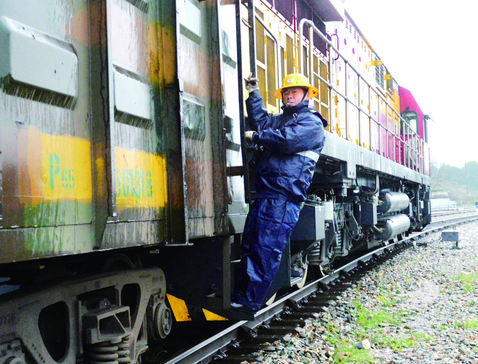 阳岗山认真检查着牵引机车后部的5辆车。“雨水天气连接车辆风管容易打滑,一定要站稳了后再作业,尾部防护人员要注意核对车辆号码,加强与组内人员的作业联系……”无线电台里,阳岗山叮嘱着注意事项。车辆风管、货物装载、钢轨表面……他们不住地低头弯腰,检查确认,不放过任何一处细节。“3号连结员作业完毕。”“1号、2号连结员作业完毕。”“4号连结员核对尾部车号。”松开人力制动机、确认车辆通风良好后,调车机牵引着53节车辆向着出发场驶去。