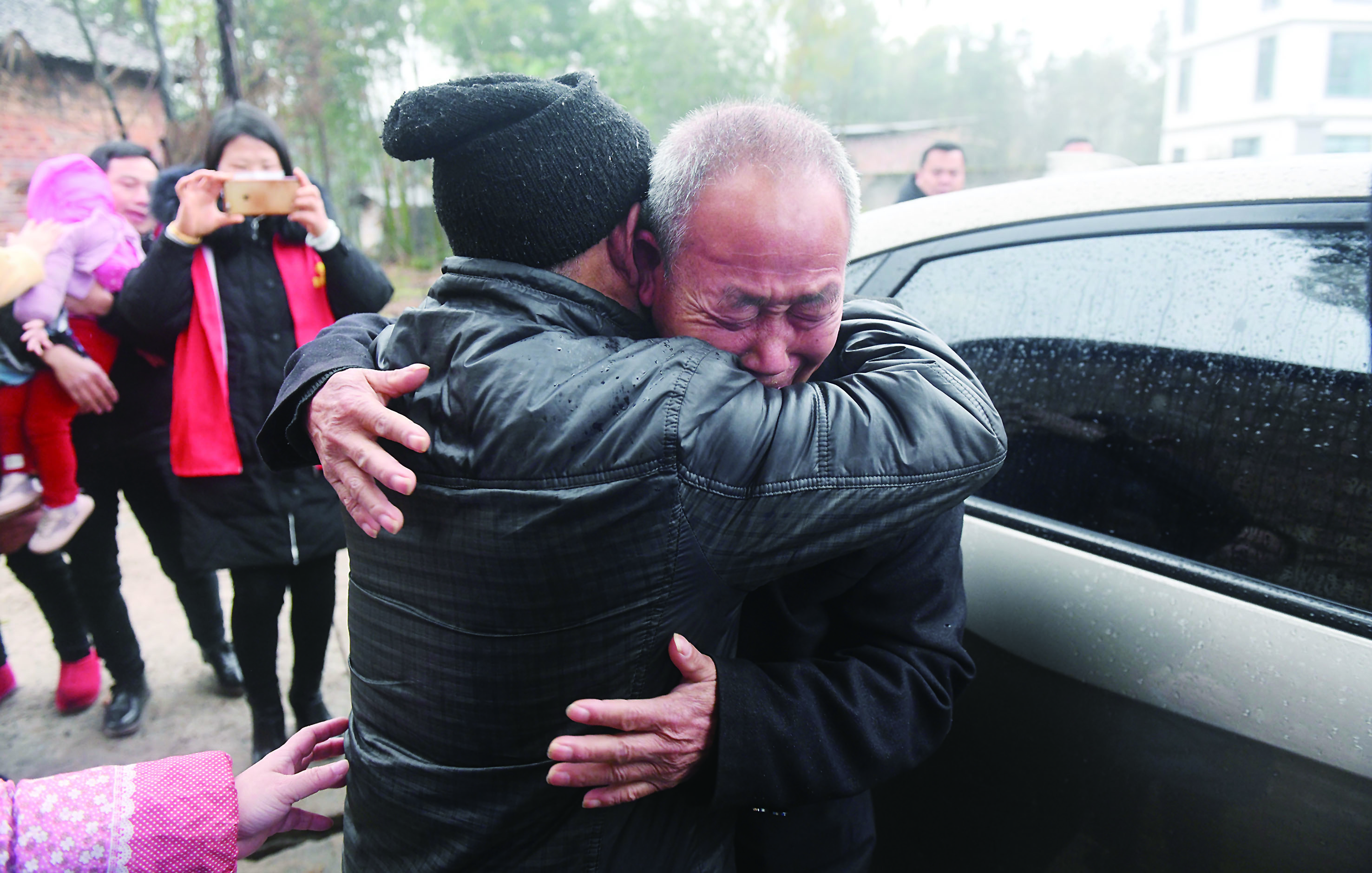 2月9日上午10点34分,刘卫权坐车来到河田村,在距离刘卫民家还有几十米时,车子已经被团团围住,刘卫民紧紧抱住刘卫权,两位头发花白的老人当场号啕大哭。