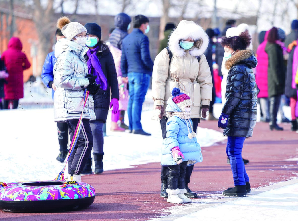 2月18日,人们在哈尔滨湘江公园游玩。 当日,哈尔滨市利民开发区裕田街道、呼兰区建设路街道疫情风险等级调整为低风险。至此,哈尔滨市高、中风险区域全部清零。