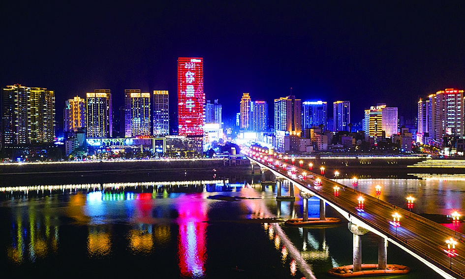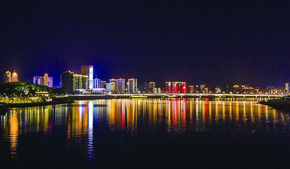 ▲璀璨的灯光倒映在江中