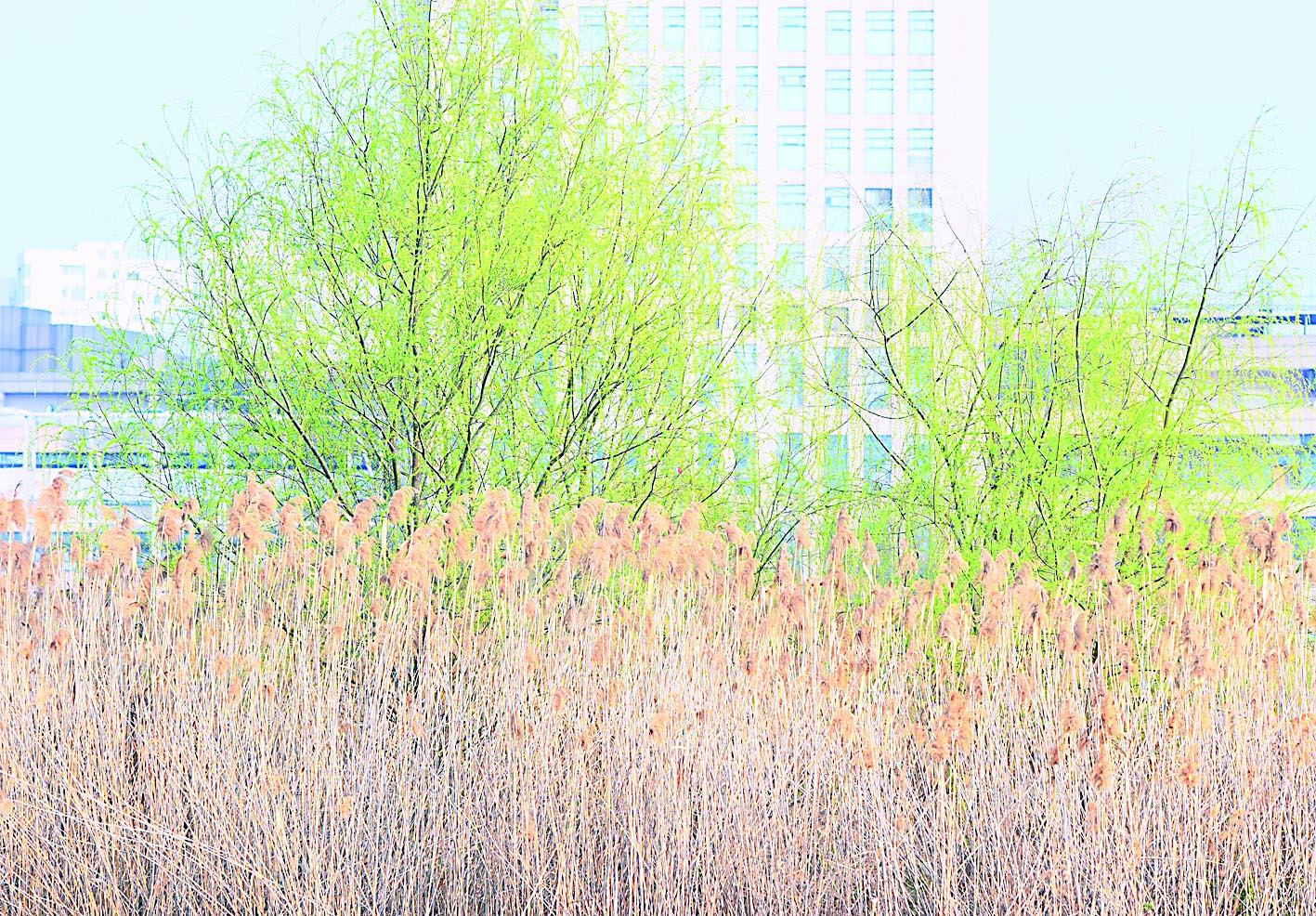 ▲神农城湖中干枯的芦苇与新发的绿芽形成鲜明对比