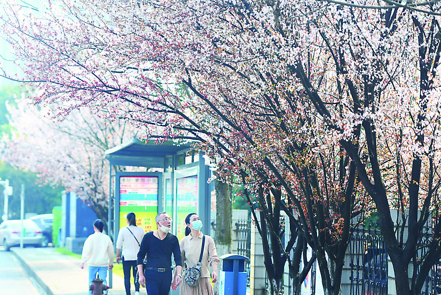 ▲滨江路逐渐绽放的桃花