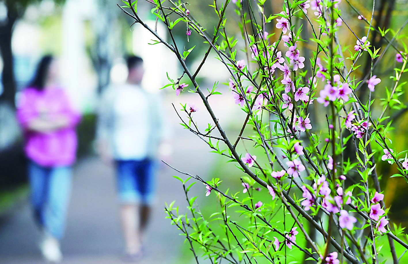 河西滨江路上,一朵朵粉红的桃花开得正艳,在阳光的照耀下闪闪发光。一位身穿粉色秋衣的姑娘拉着男友,来到这开满桃花的树下,拿出手机不停地摆出各种美丽动人的姿势,脸上的笑容比花还灿烂。
