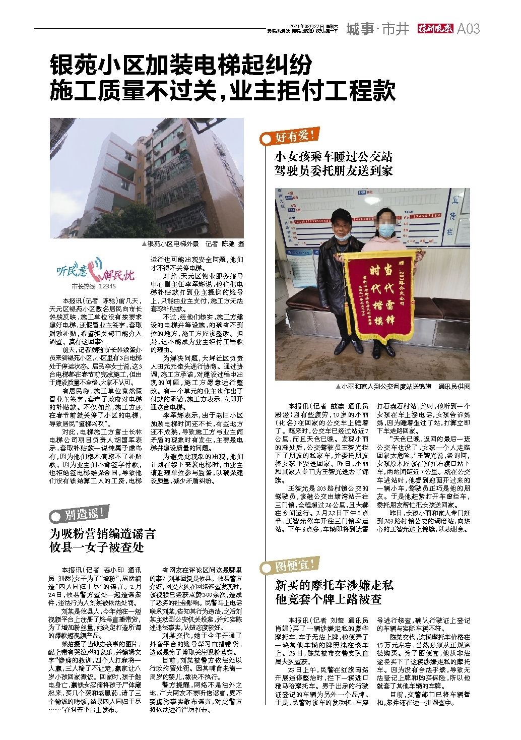 银苑小区加装电梯起纠纷 施工质量不过关,业主拒付工程款