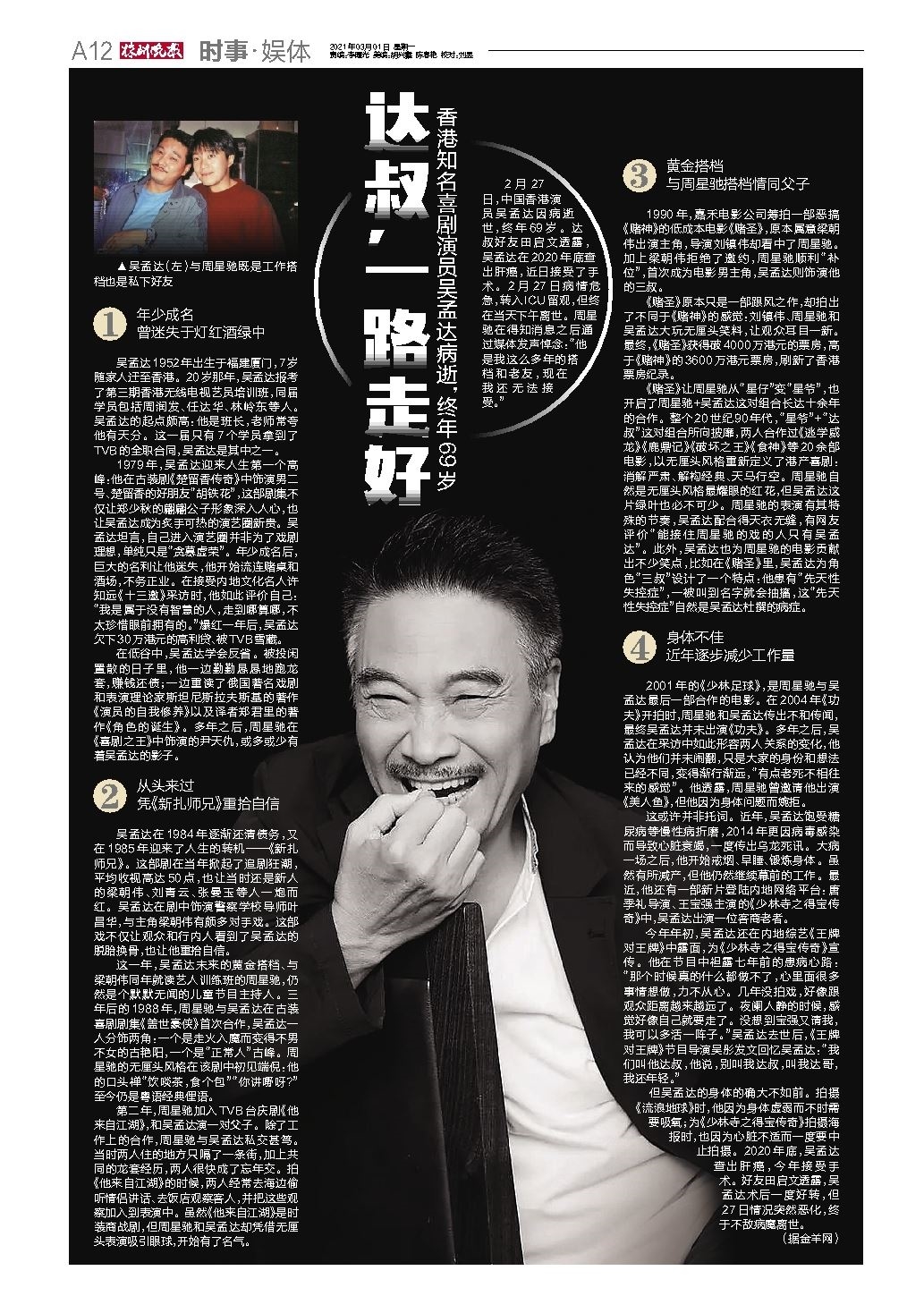 香港知名喜剧演员吴孟达病逝,终年69岁