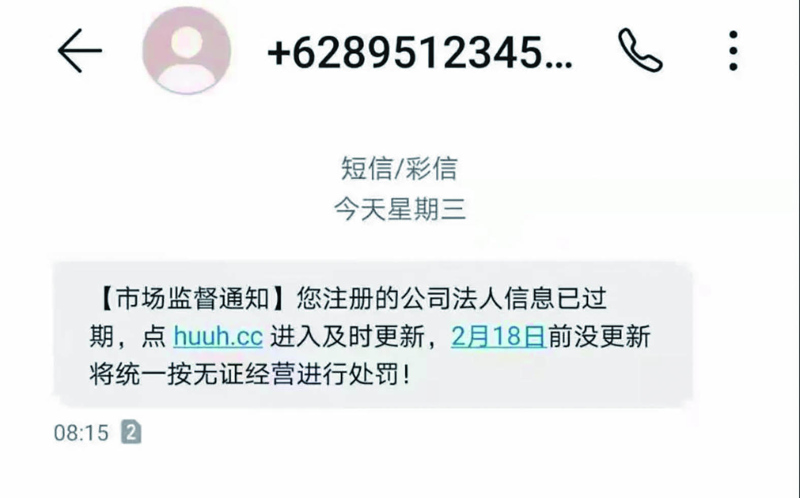 本报讯(记者 姚时美 通讯员 刘再武)“市场监督通知,您注册的公司法人信息已过期……”春节期间,一些企业经营主收到这样的短信,里面还有网址链接,一旦点击进去输入银行账号和密码,卡里的钱财就会不保。为此,市市场监管局近日发布风险提示,这种短信别信。