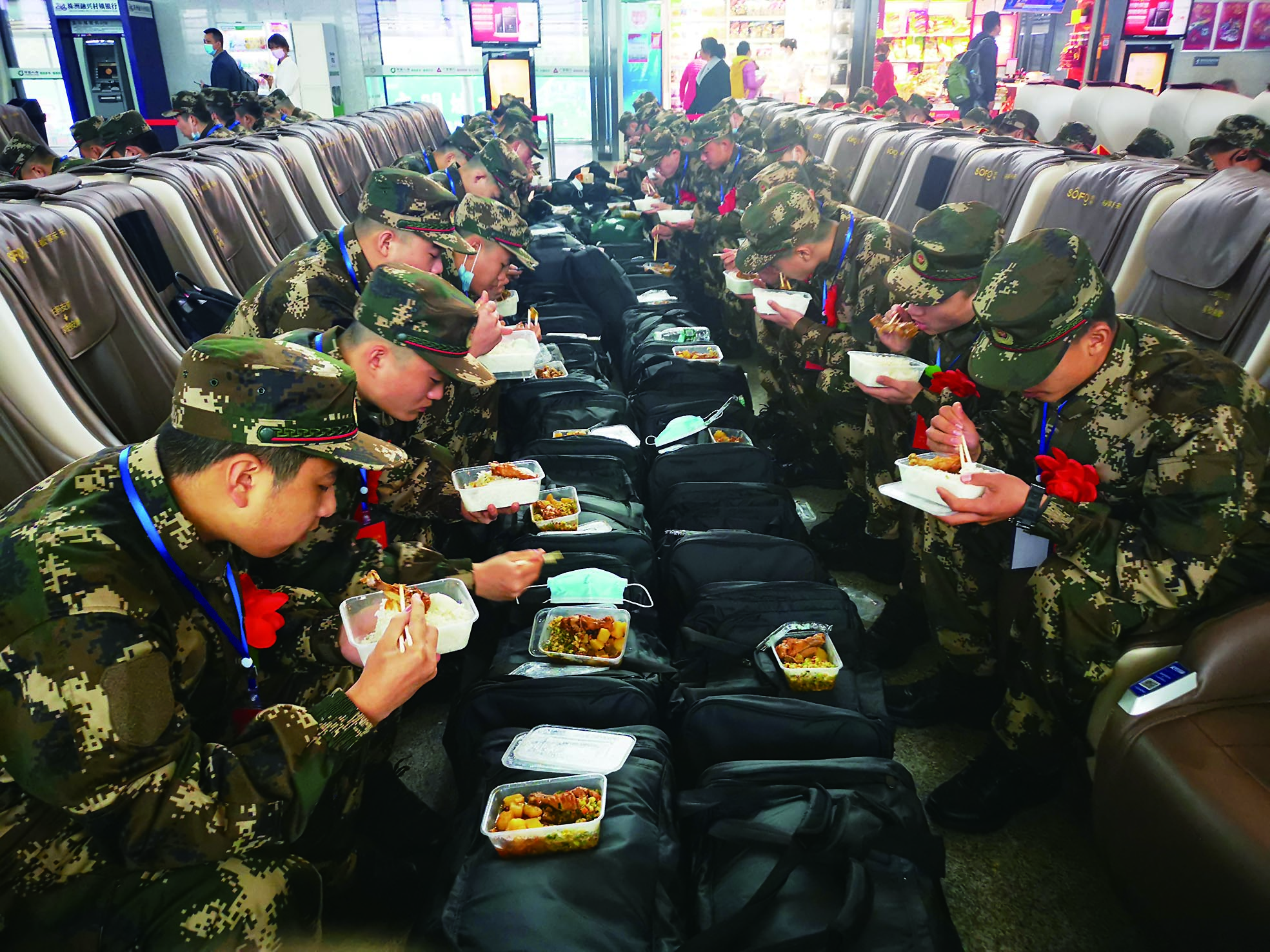 “谢谢你们送来午餐,可能我们要过几年才能吃上家乡菜了……”或许是触景生情,两个新兵边吃边偷偷抹泪。