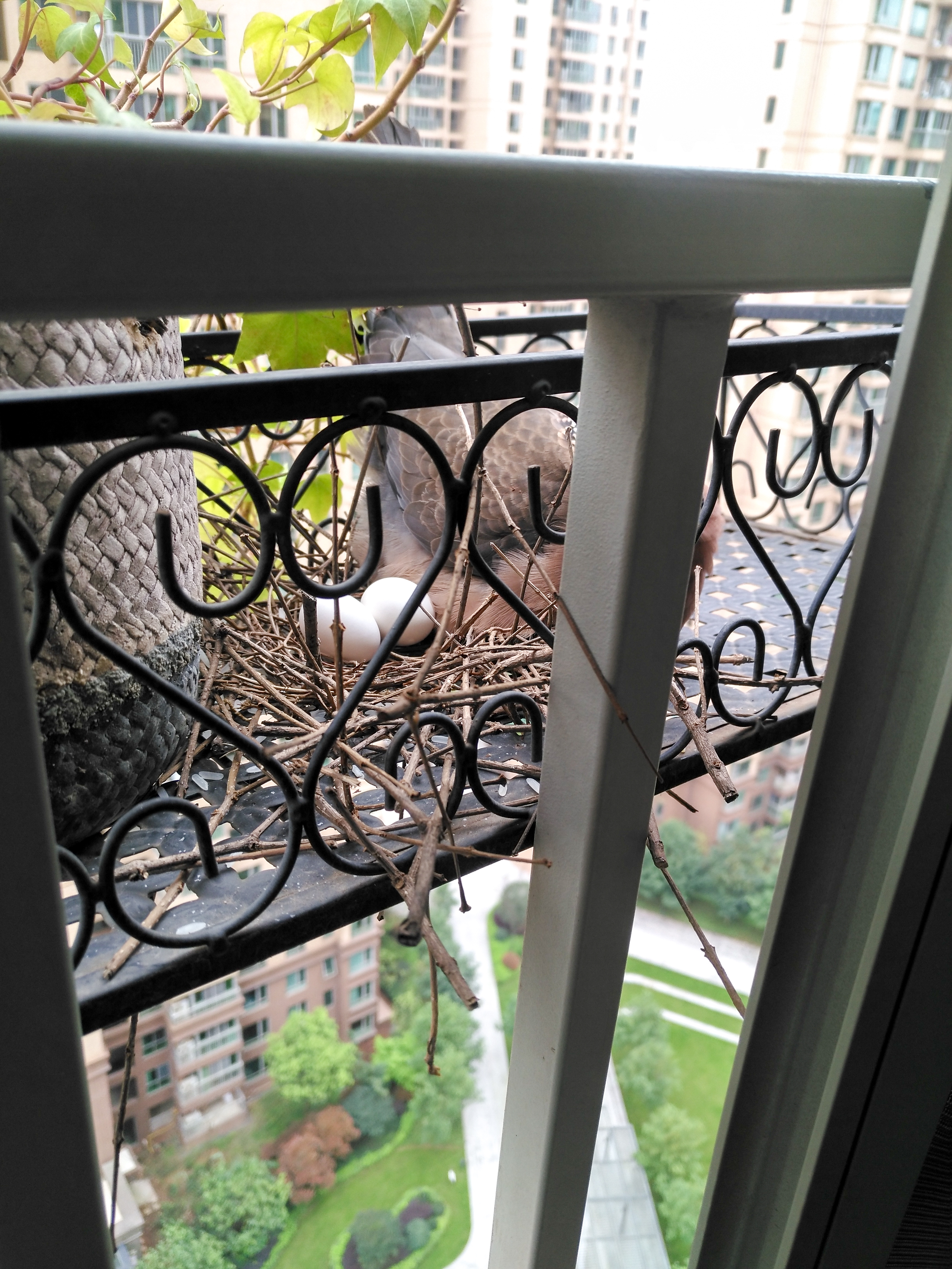 “前段时间给绿植浇水时,鸟妈妈扑腾了几下翅膀,露出了两颗洁白的鸟蛋。”章女士说,她仔细观察着鸟妈妈的一举一动,它有时会发出“咕咕”细微鸟鸣,有人凑近去看时,它会立即警觉起来,展开双翅保护鸟蛋。喜欢小动物的章女士决定,尽量不去阳台,让鸟妈妈安心孵蛋。