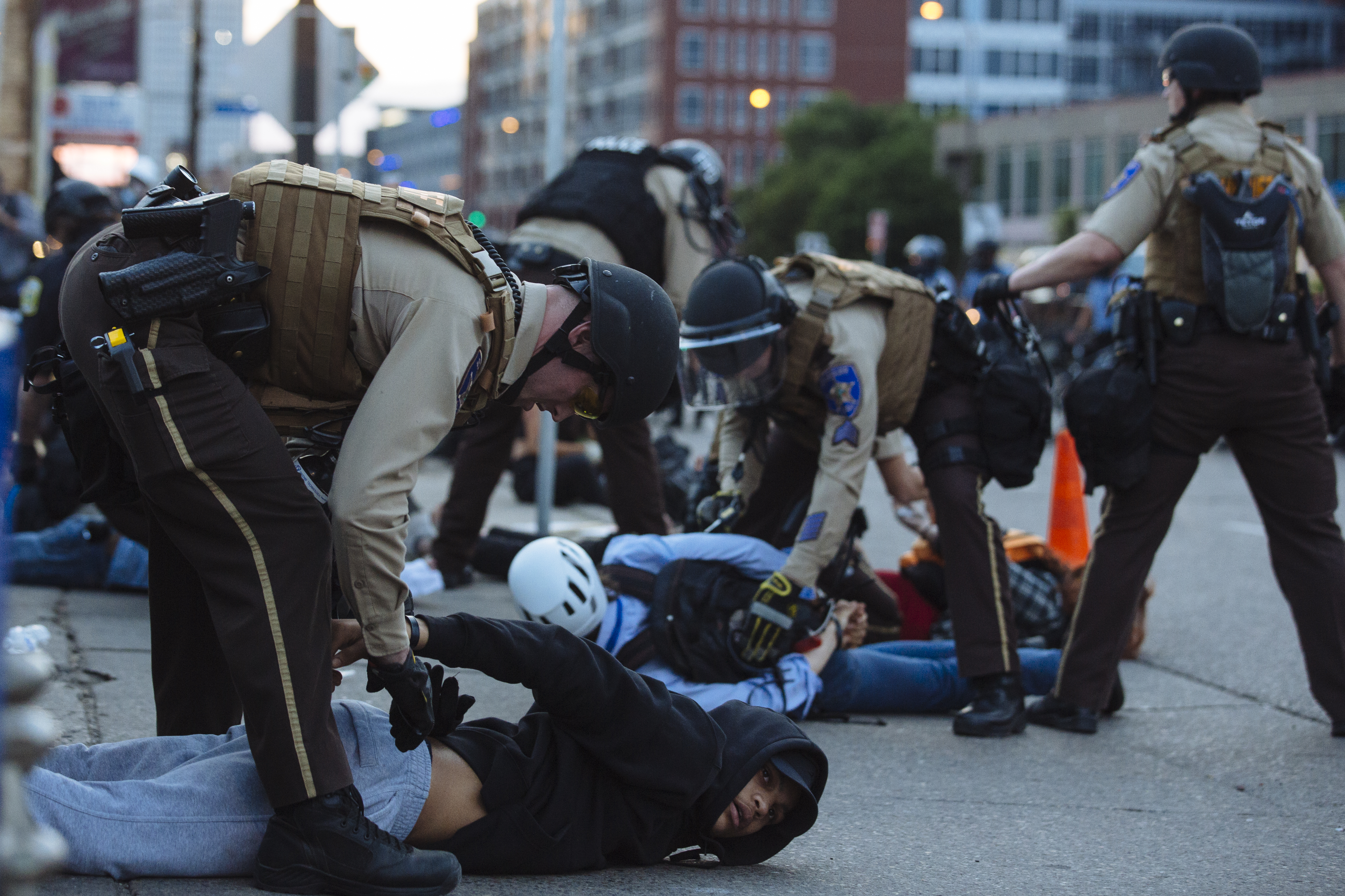 ◀2020年5月31日,抗议示威者在美国明尼苏达州明尼阿波利斯市被警察逮捕。明尼苏达州非洲裔男子乔治·弗洛伊德2020年5月遭白人警察暴力执法后窒息死亡,引发全美大规模抗议 据新华社