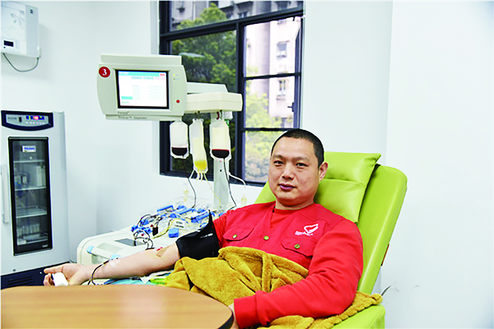 ▲龚仕民正在捐献机采成分血 通讯员供图