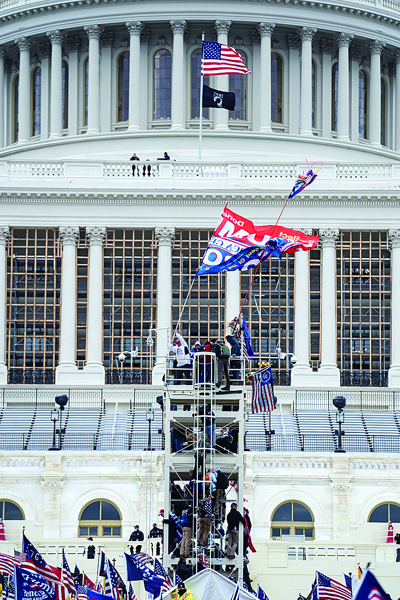 ▲2021年1月6日,在美国华盛顿的国会大厦前,特朗普的支持者爬上用于总统就职典礼的媒体拍摄高台 新华社记者 刘杰 摄