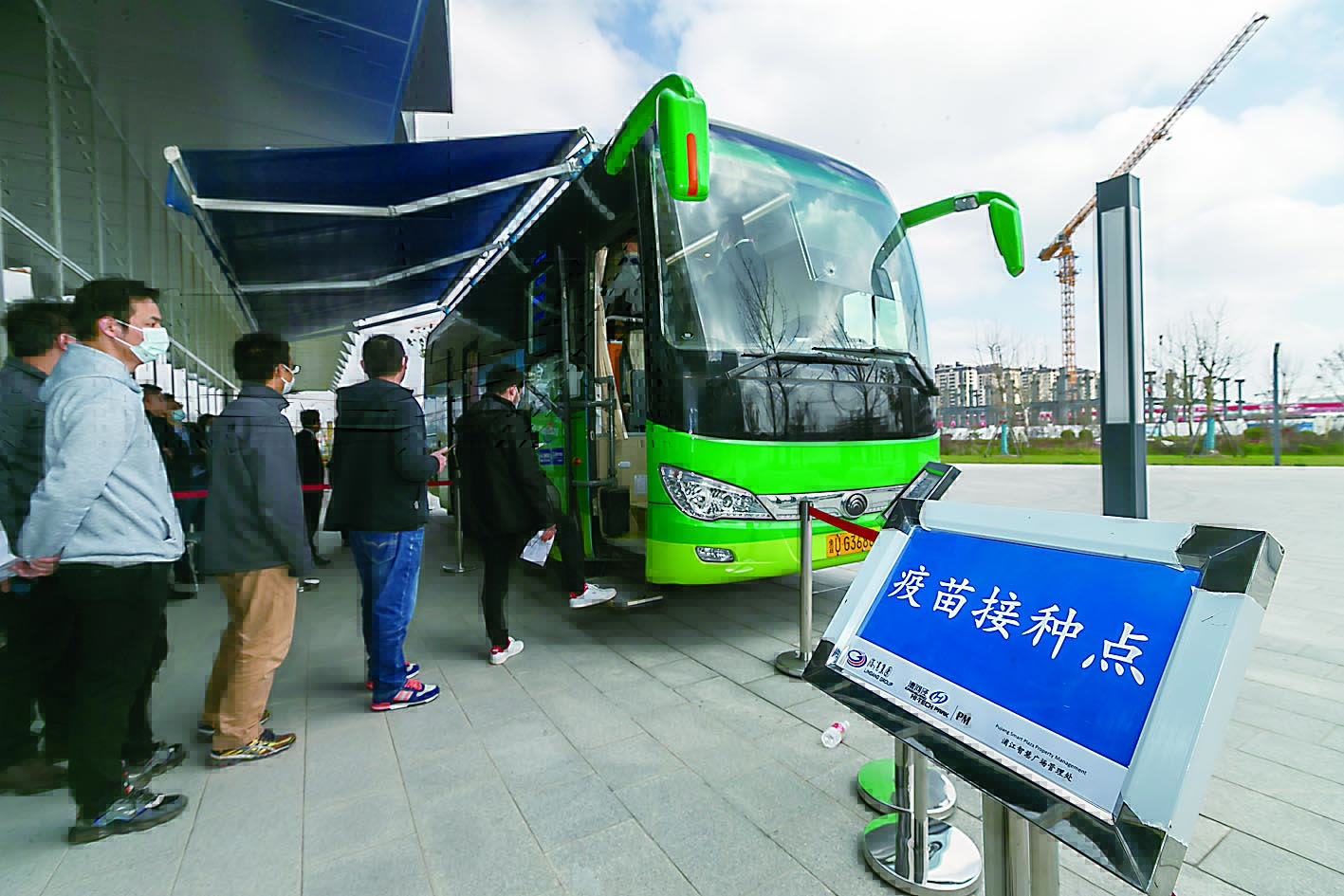 3月26日,企业员工在疫苗接种点排队等待。 近日,上海首辆移动预防接种车驶入闵行区浦江镇临港园区,为企业员工提供新冠疫苗免费接种服务。 据了解,移动预防接种车于3月24日开始在上海进行新冠疫苗接种服务,未来车辆将服务于当地高校、企业等群体性疫苗接种工作。 这辆移动预防接种车设有2个固定接种单元,每个接种单元配有1个移动冰箱,另设1个储存冰箱,共可储存疫苗1200支左右。移动预防接种车的接种条件与定点接种单位条件相同,确保疫苗接种质量安全。 (据新华社)