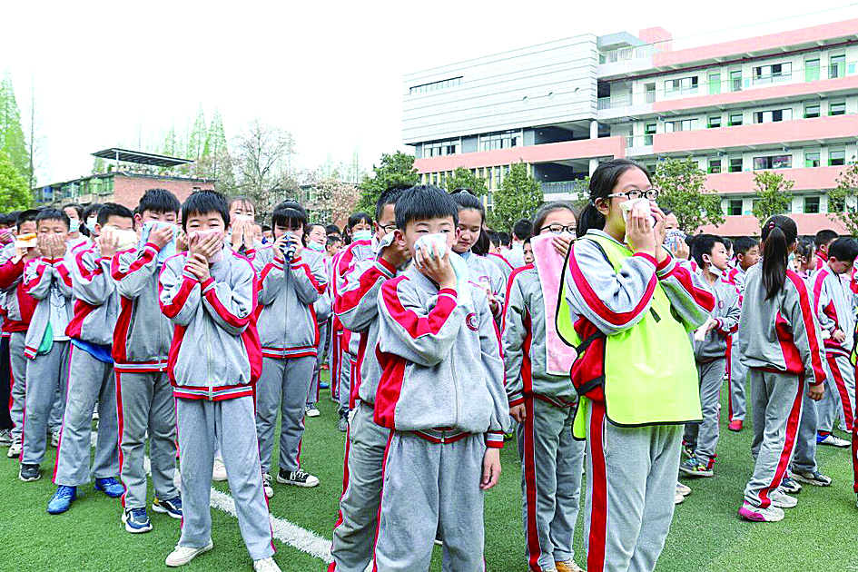 当警报声响起,全校师生按既定路线有序疏散,用湿毛巾、衣物捂住口鼻,俯身前行,各班由班主任在前面带路,副班主任押后,确认无学生遗留,确保学生安全疏散。撤离教学楼后,各班在早操场集合,迅速清点本班人员,并向计时员报告本班应到实到人数。整个疏散过程用时4分59秒,学生全部安全抵达疏散地点,较好地达成了演练目标。