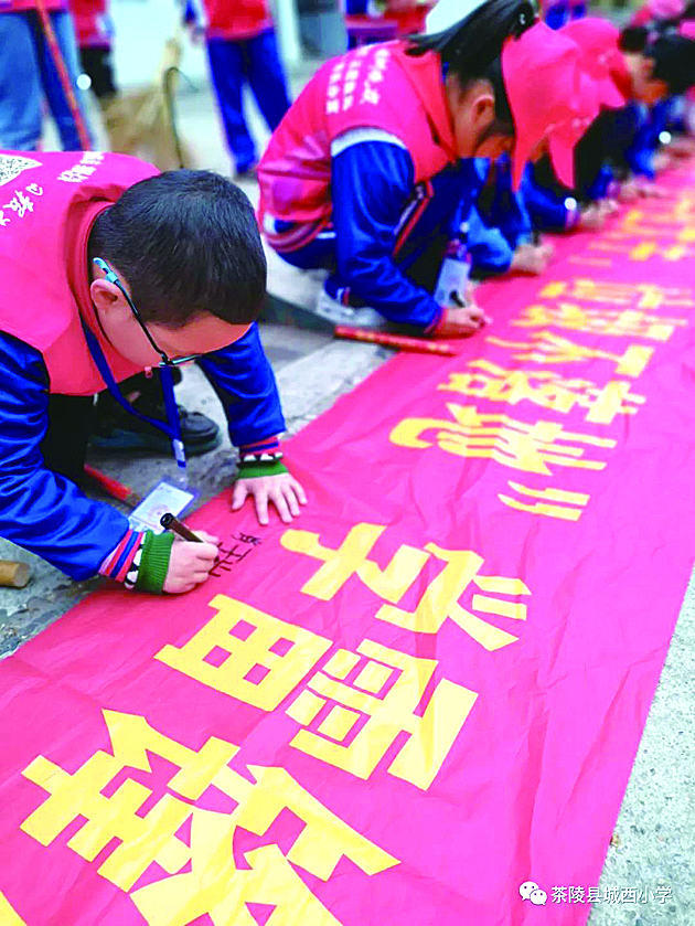 3月19日,茶陵县城西小学的同学们手持扫帚、垃圾桶来到校外进行街道清扫,在劳动中体验快乐。图为孩子们在学雷锋活动中签名。 何弯 摄