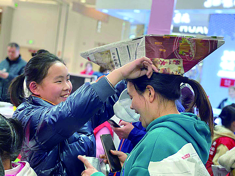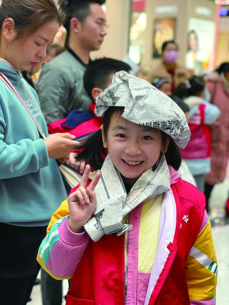 环保时装秀,校园记者和家长们利用手中的旧报纸,做出了各种各样奇特有趣的服装和配饰。看,舞台上的他们,都是最闪亮的星。