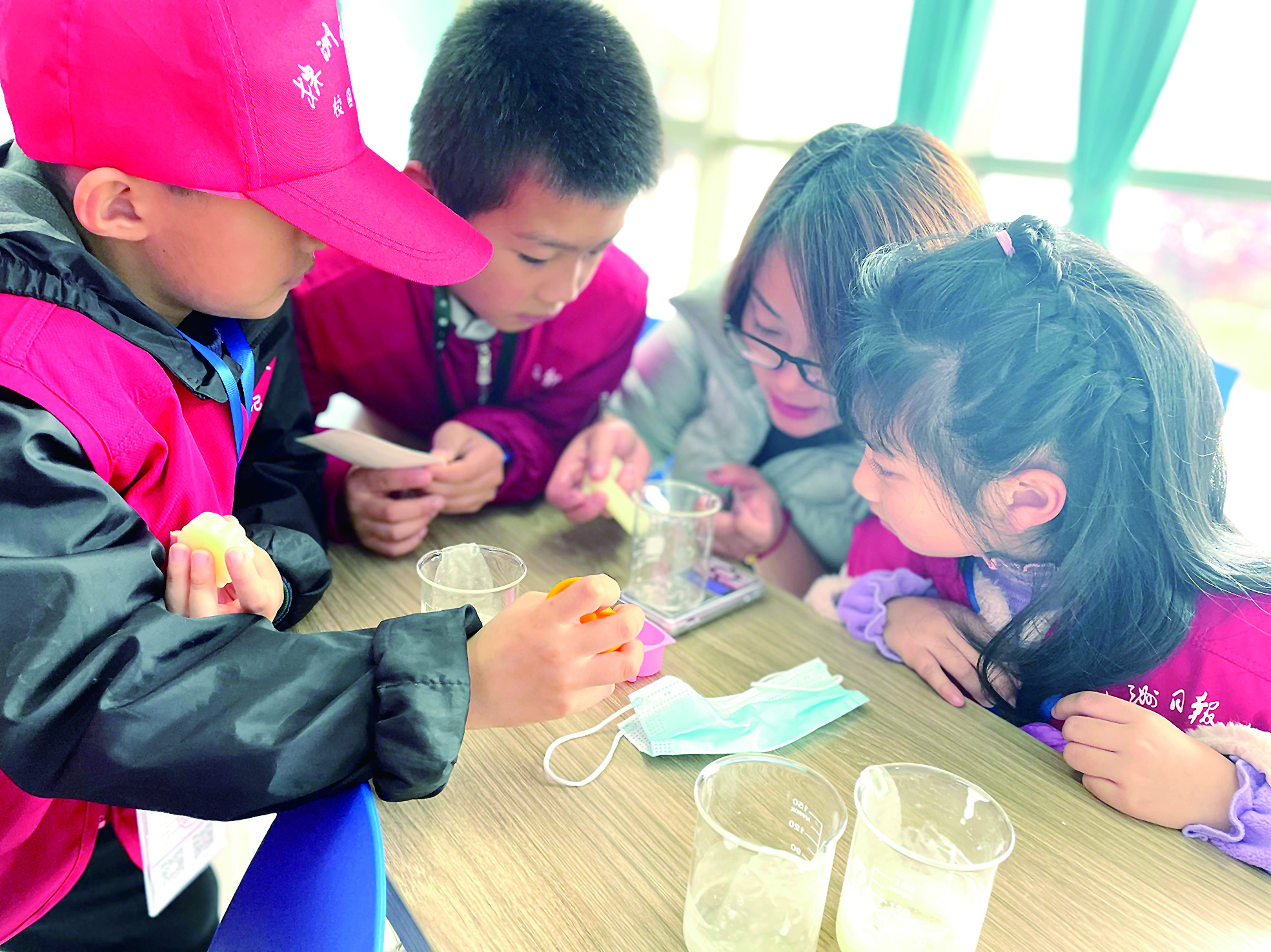 ▲辅导老师和孩子们一起研究香皂制作步骤 彭慧洁 摄