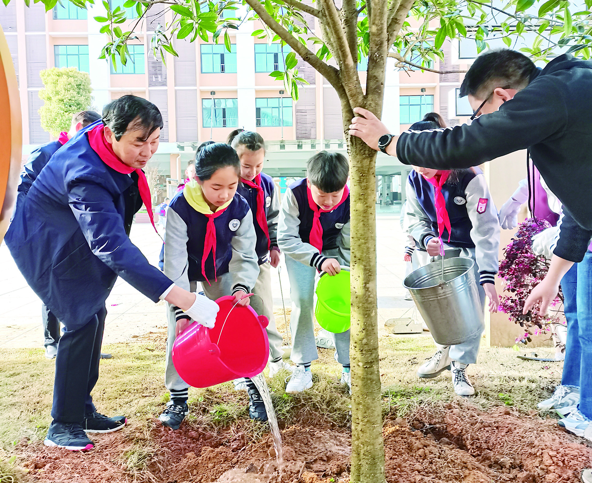 王建勇和少先队员们一起挥锹铲土,植入树苗并培土围堰、浇灌施肥。王建勇表示,通过这样的活动,希望孩子们能提升爱护自然、保护环境的意识,能像小树苗一样茁壮成长,成为优秀的社会主义建设者和接班人。