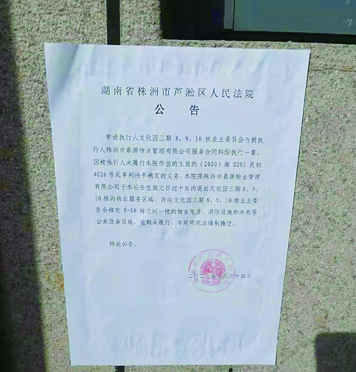 3月24日,芦淞区法院的一纸强制执行公告出现在文化园三期(8、9、10栋)物业的门口。因业委会与株洲市鼎源物业管理有限公司(下简称“鼎源物业”)服务合同纠纷一案,鼎源物业未履行已生效的(2020)湘0203民初4026号判决义务,被要求退出现服务区域,并移交相关的物业用房,否则将被强制执行。至此,拖了两年的物业移交程序,终于走到了强制执行阶段。