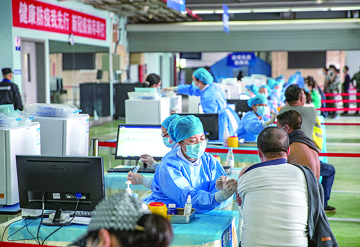 ▲3月27日,在重庆市九龙坡区奥林匹克体育中心新冠疫苗临时集中接种点,医务人员为居民接种新冠疫苗 新华社记者 黄伟 摄