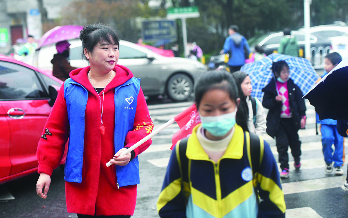 ▲3月18日早上,香香姐在护学岗护送孩子们安全过马路