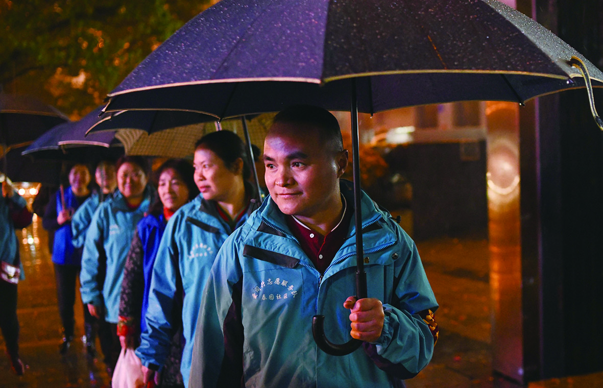▲3月16日晚,天空突降大雨,刘学敏和队员们照常上街巡逻