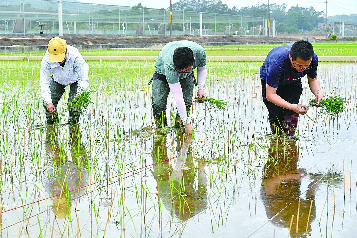 在试验田基地,记者看到,研究人员首先把8组双行红绳拉到田间,然后把“天稻”秧苗有序地摆放在田基,在去掉部分顶端的叶片后,再沿着红绳的位置一株一株整齐插入土中。整个过程持续约一小时。