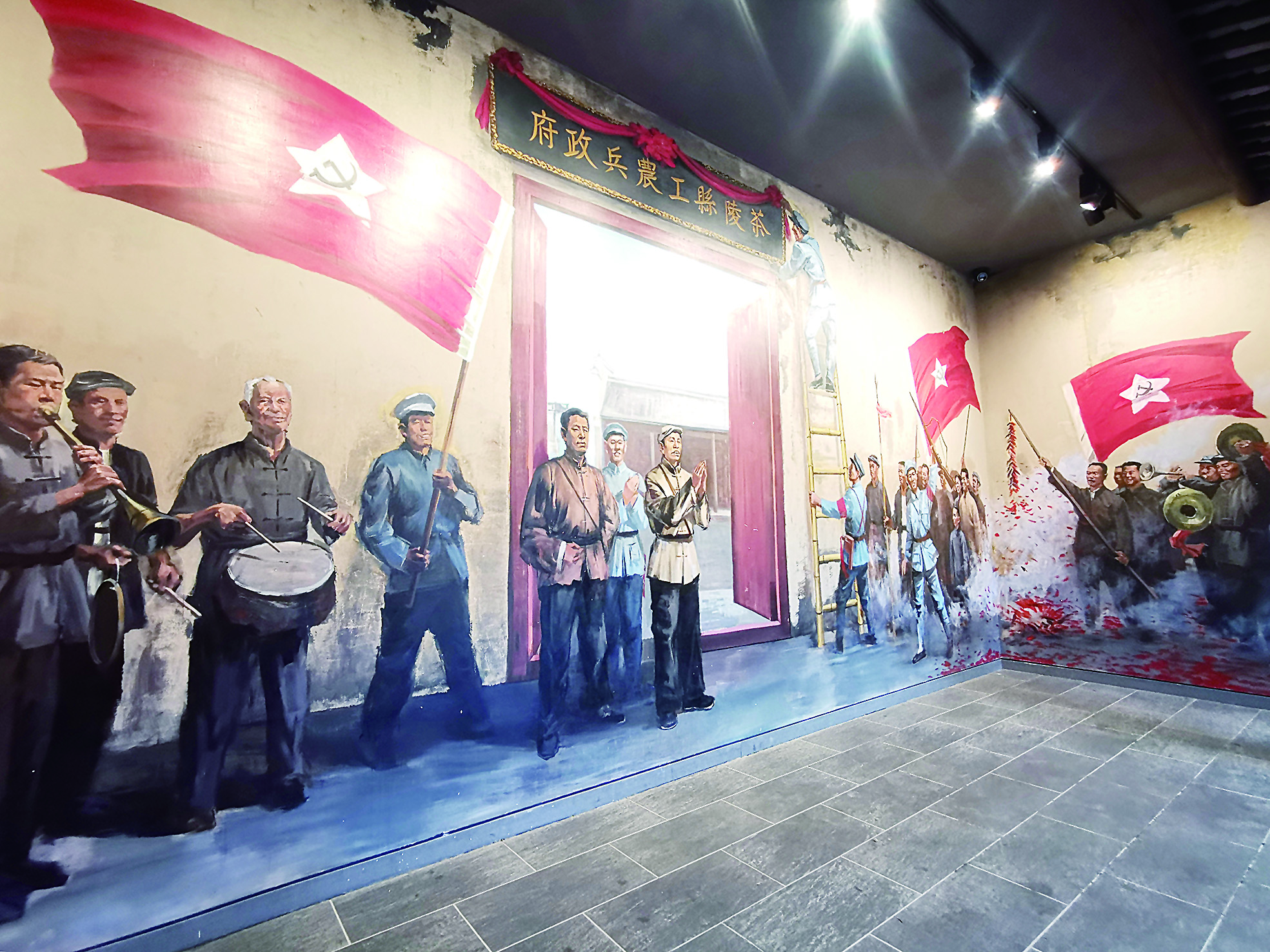在茶陵县工农兵政府旧址的展厅里,有一幅连跨多个墙面的彩画。画面正中的两侧,群众吹号打鼓、欢天喜地。而在画面正中央,一名士兵正在为写着“茶陵县工农兵政府”的牌匾挂起红绸。