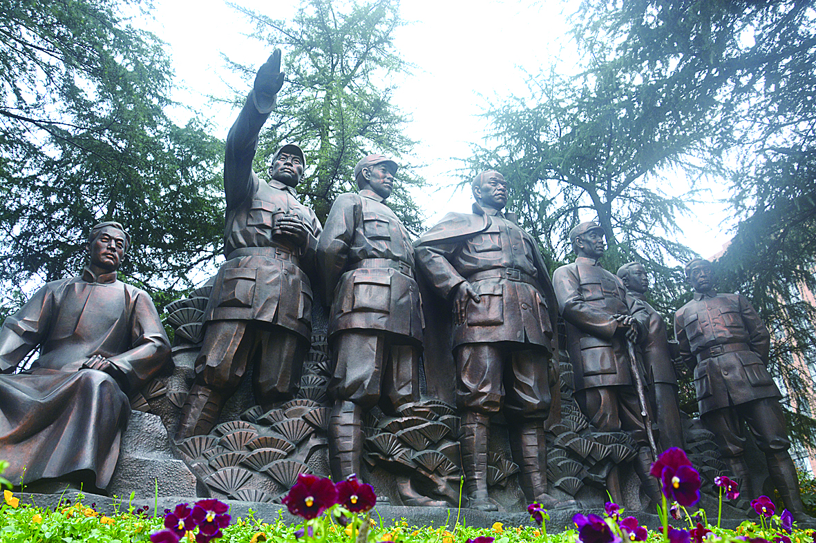 步入流芳园,“烈士纪念园”五个镏金大字镶嵌在巨石上,刚健大气,遒劲有力。园门正中央的烈士铜像被青松翠柏所环抱,正气凛然,神采奕奕。先烈们或坐思救亡之路,或叉腰伫立,或驻足远眺,面容刚毅,目光如炬。铜像被灿烂的阳光照得金光闪闪、熠熠生辉。放眼望去,犹如熊熊烈焰,要烧尽人间罪恶,换得日月新颜。