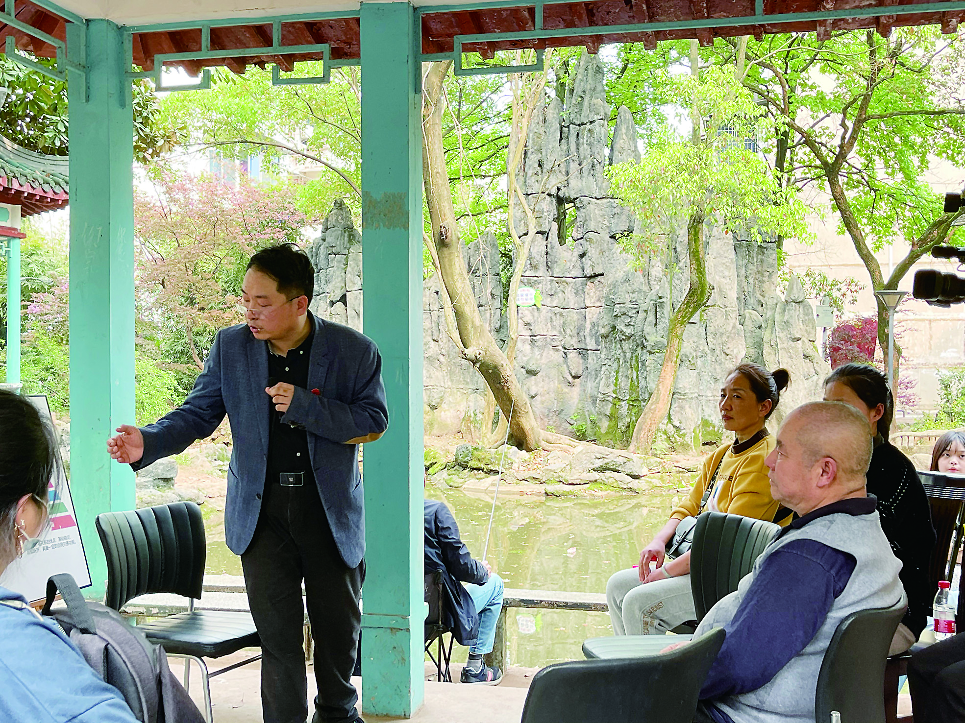 ▲座谈会现场,设计顾问、湖师大教师沈竹给居民讲解“微亮化”设计方向 记者 伍靖雯 摄