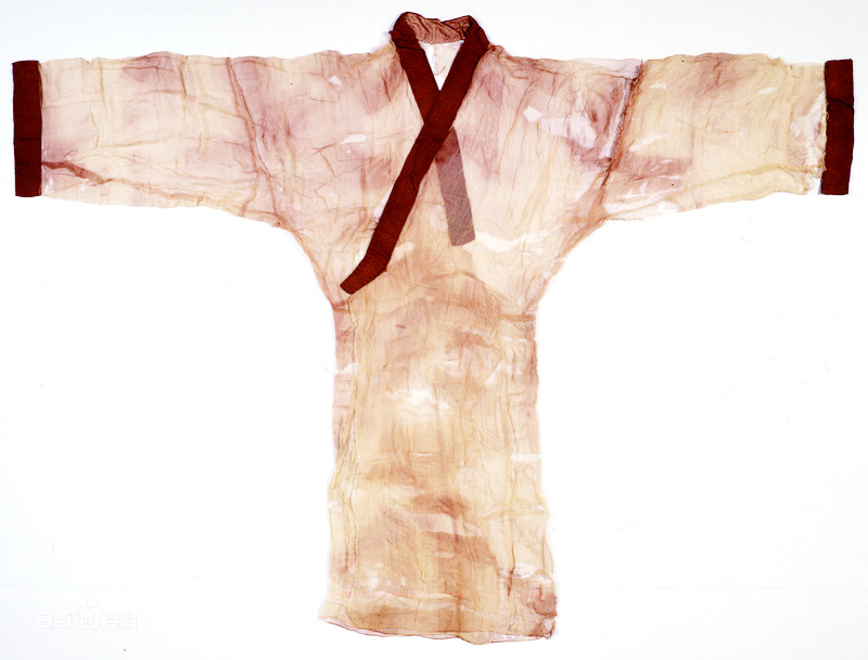 直裾素纱襌衣为交领、右衽、直裾式、袖较宽,衣长128厘米,通袖长195厘米,袖口宽29厘米,腰宽48厘米,下摆宽49厘米,重49克,轻若烟雾,薄如蝉翼,织造技术之高超,实属巧夺天工。