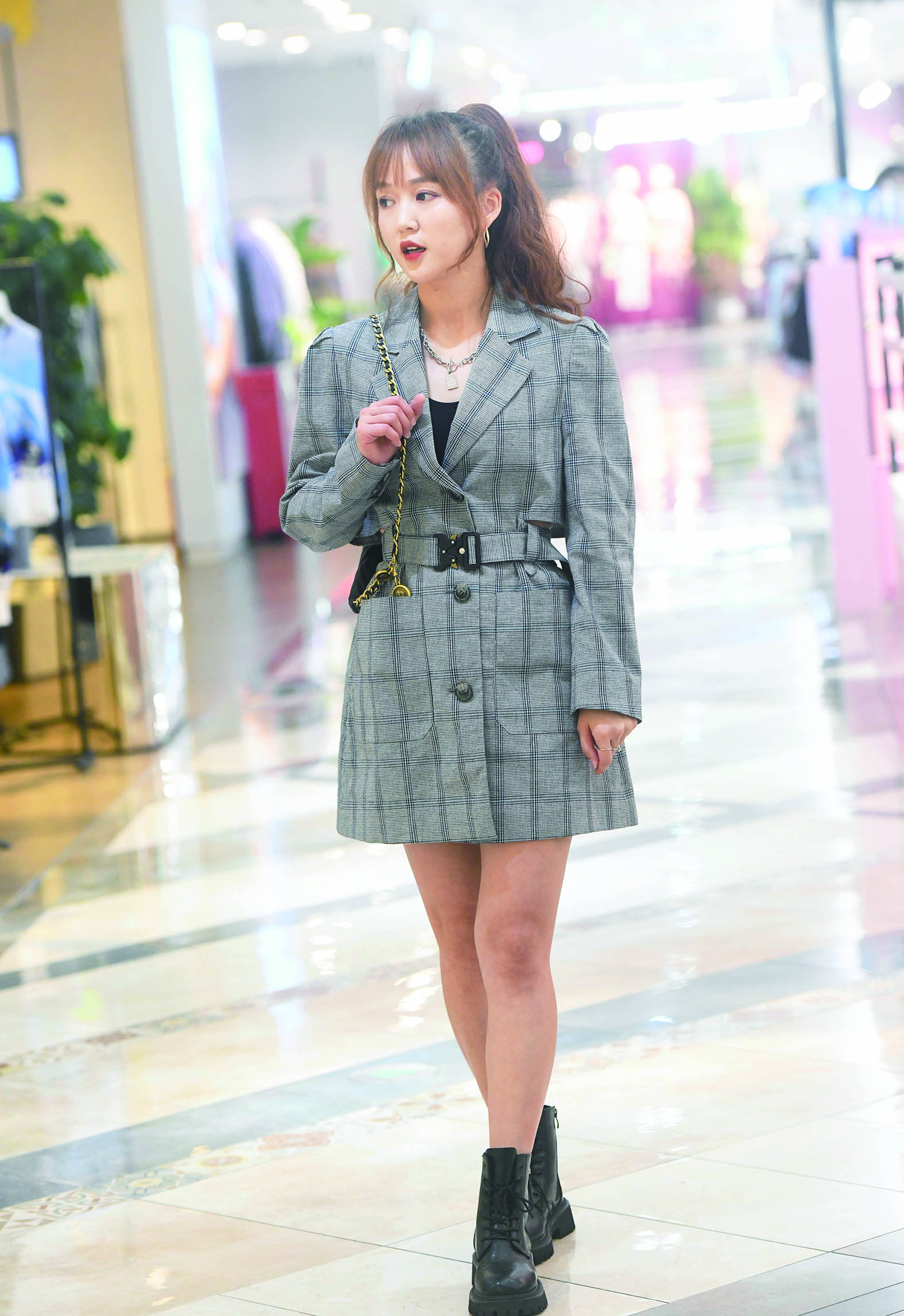 西装裙要避免宽宽大大的款式。选择有腰身的,或者搭配一条腰带,会显得身材比例更好。短款马丁靴则可以拉长腿部线条,显得帅气十足。