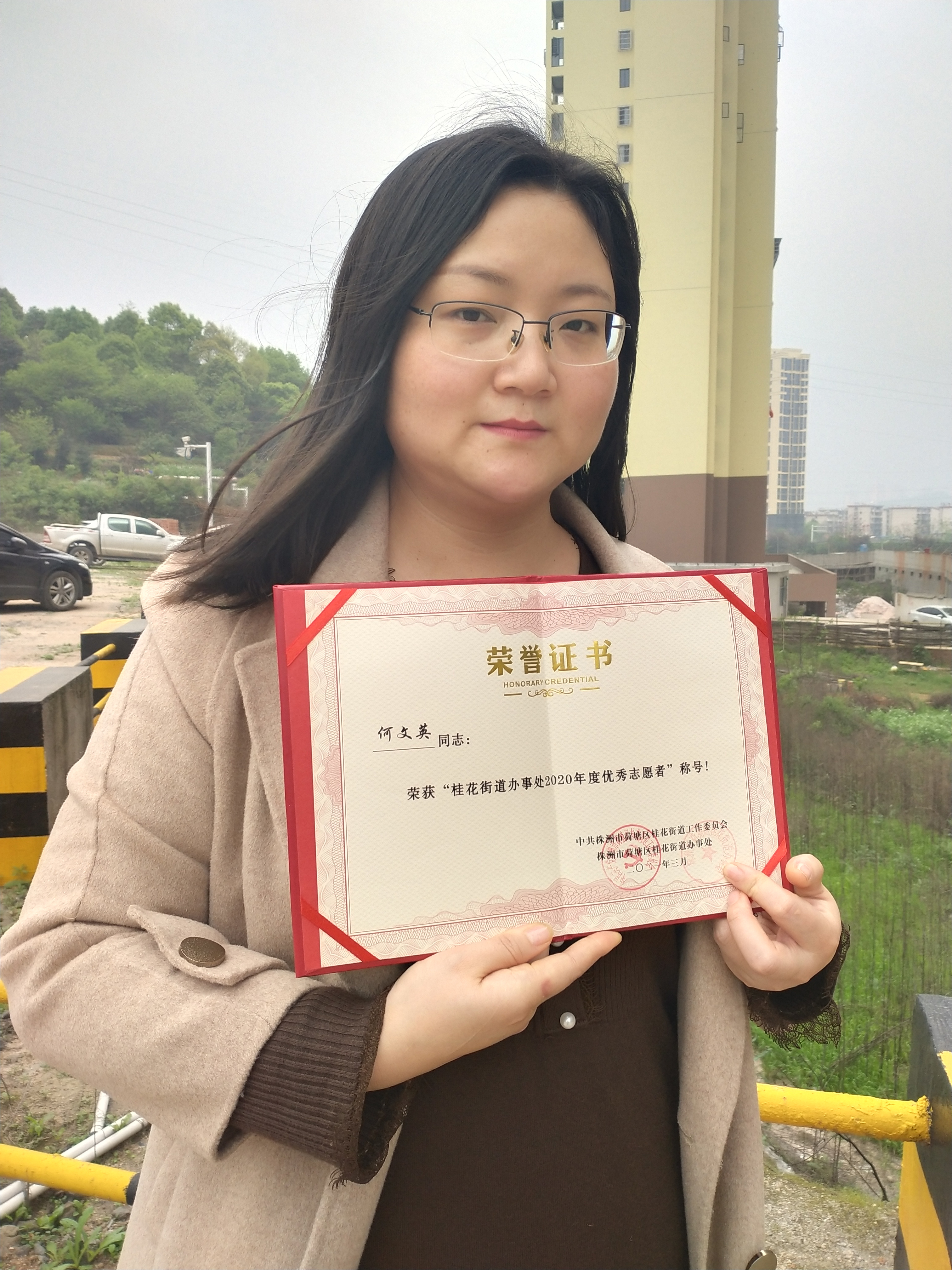 因为在志愿服务中耐心细致,3月30日桂花街道举行的志愿者表彰大会中,何文英荣获了“优秀志愿者”称号。